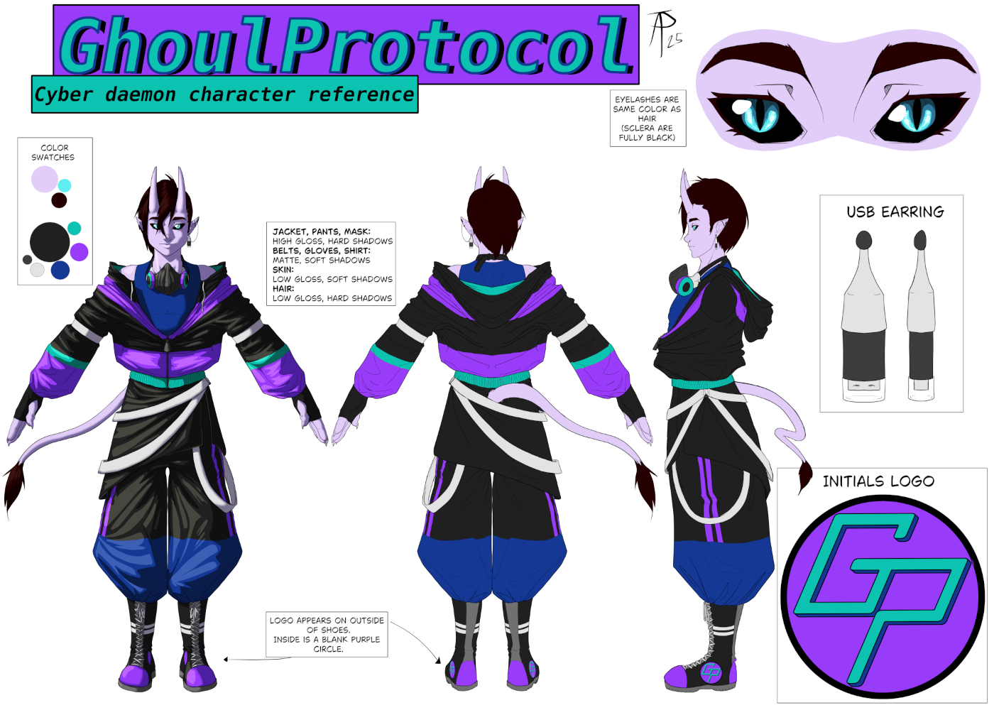 Design sheets include front, back, and side views along with 3 focal points. Creature design Includes illustration from ~3/4 view and 5 focal points.